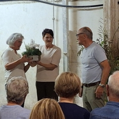 Zuerst bekamen wir einen leckeren selbstgemachten Aperitif aus Kräuter und Rosenblätter, wobei uns Frau Weiß die Entstehung und die damalige Idee des Kräutergarten erklärt hat.