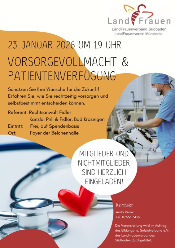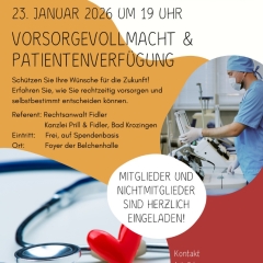 Am Freitag, den 23.01.2026 um 19 Uhr, findet im Foyer der Belchenhalle ein Vortrag mit Rechtsanwalt Fidler von der Kanzlei Prill&Fidler zum Thema Vorsorgevollmacht und Patientenverfügung statt.